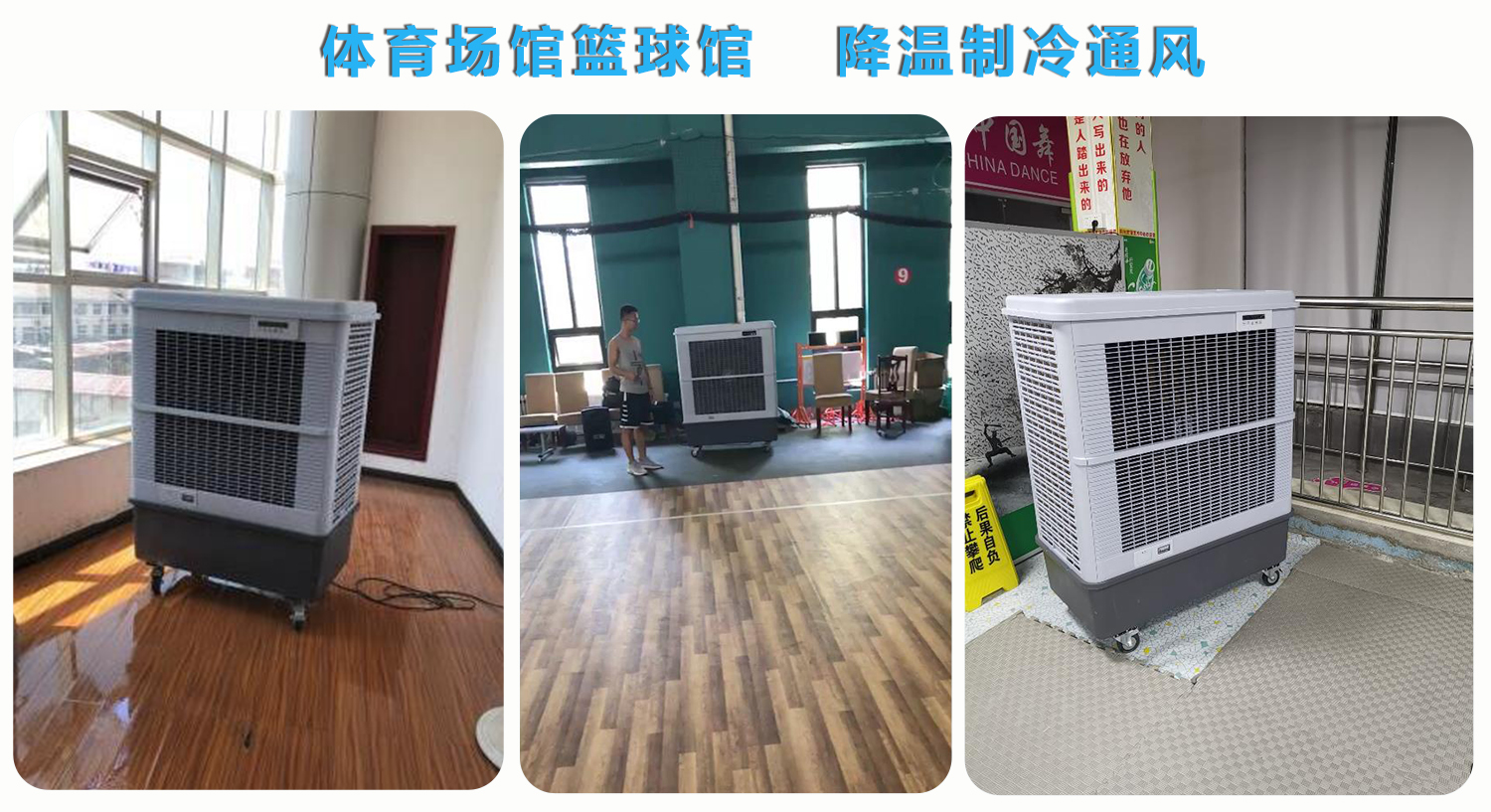体育场篮球馆空间高大,在夏天随着温度的升高,加上剧烈运动,会感到非常闷热,且运动出汗后,忽冷忽热容易导致感冒等情况,那么合适的降温通风设备显得尤为重要,选择移动式冷风机来布局一些活动、休息点,用以满足这特殊的环境需要,可以通风降温,消除闷热、异味,有效促进全方位空气流动,大面积微风吹来,为前来运动的人们创造凉爽、舒适、健康、自然的环境。