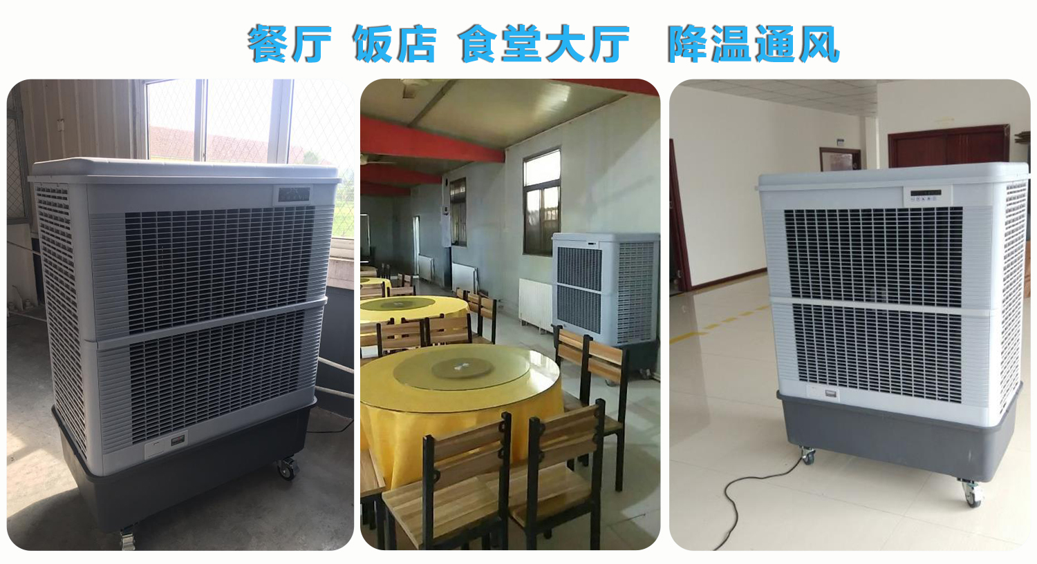 2. 通风降温换气一体,优化就餐环境:采用蒸发式制冷原理,无氟利昂排放,绿色环保;降温过程无冷凝水滴落,不会弄湿就餐者衣物、电子设备,也不会导致地面湿滑,兼顾就餐安全与体验,同时符合餐饮场所卫生标准。