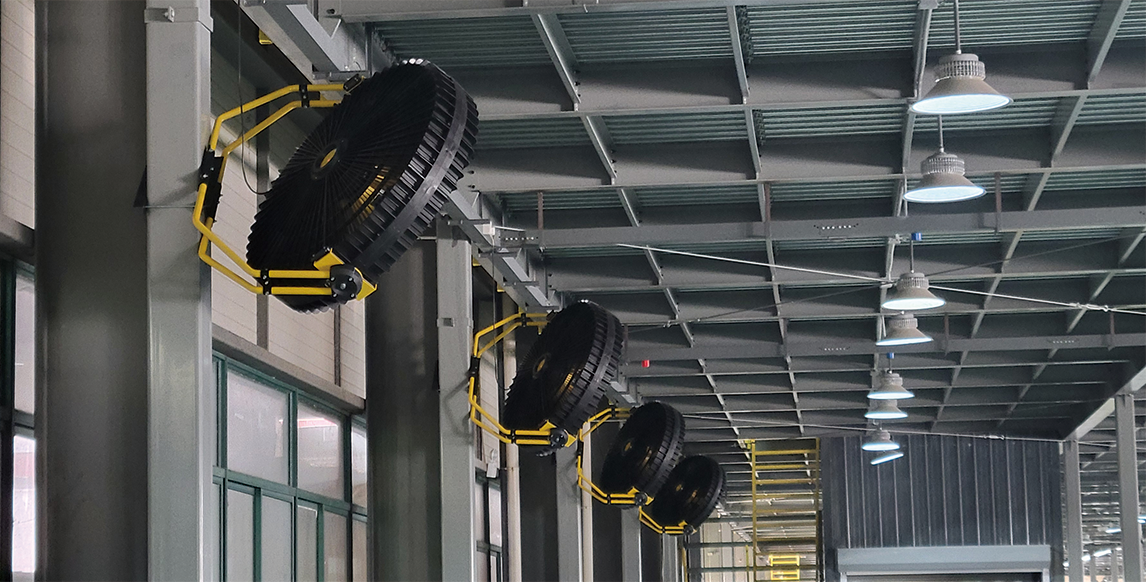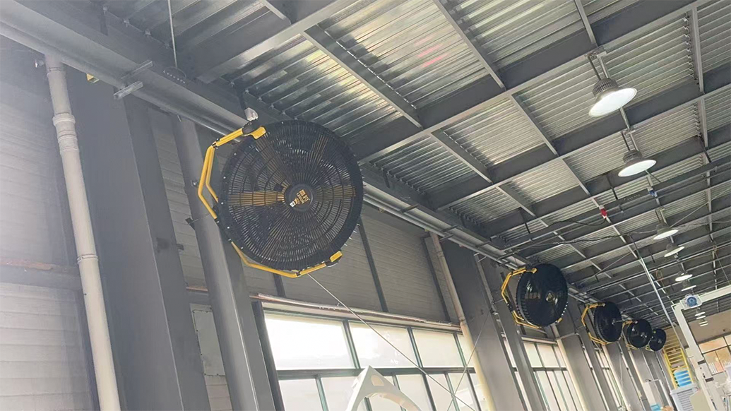 某大型机械制造工厂车间占地面积8000㎡,层高8m,车间内分布着20余个固定作业岗位,涵盖机械加工、零件装配、质量检测等关键环节。夏季高温时节,车间面临多重降温通风痛点:一是岗位区域设备密集,数控机床、冲压机等持续运转产热量大,形成局部高温区,与车间整体环境温差可达5-8℃;二是传统降温设备适配性差,落地扇、壁扇等仅能覆盖极小范围,且易与搬运车辆、作业人员发生碰撞,存在安全隐患,中央空调则因能耗过高、岗位区域降温不精准,性价比极低;三是通风效率低下,车间内粉尘与废气难以快速排出,空气污浊,长期影响员工健康与设备运行稳定性。