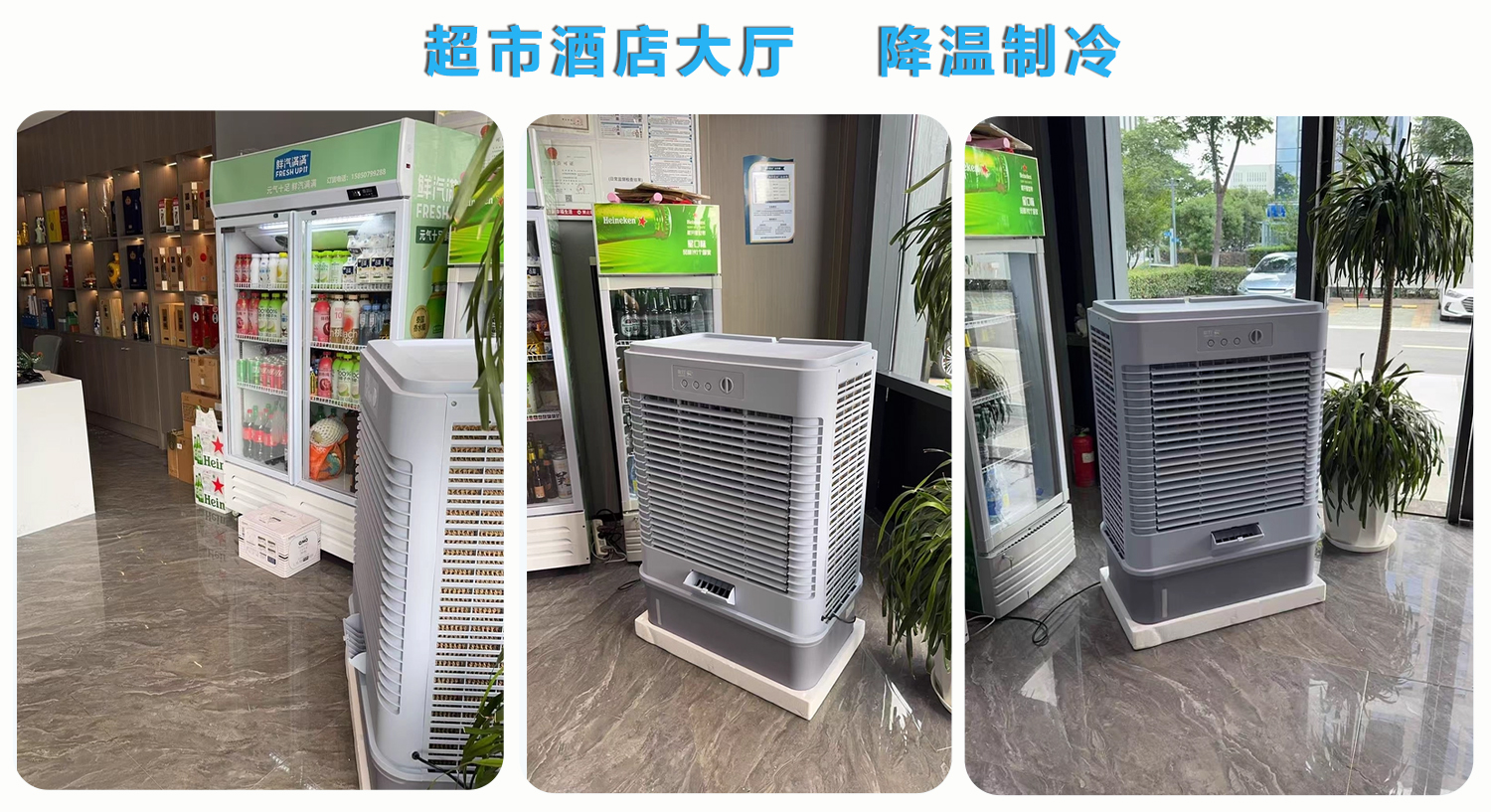 3. 运营压力与传统方案失效:为保障运营,部分商超与酒店尝试各类降温措施,但均存在明显短板:传统中央空调初始投资高、运行能耗大,酒店大厅日均电费超2000元,超市大厅也达1800元,且受空间结构影响,入口区、高大挑空区制冷效果极差,易出现“局部过冷、局部过热”;壁挂风扇或吊顶风扇仅能实现空气流动,无法降低温度,还会吹乱顾客发型、影响大厅整洁形象,酒店高端接待场景尤为不适。
