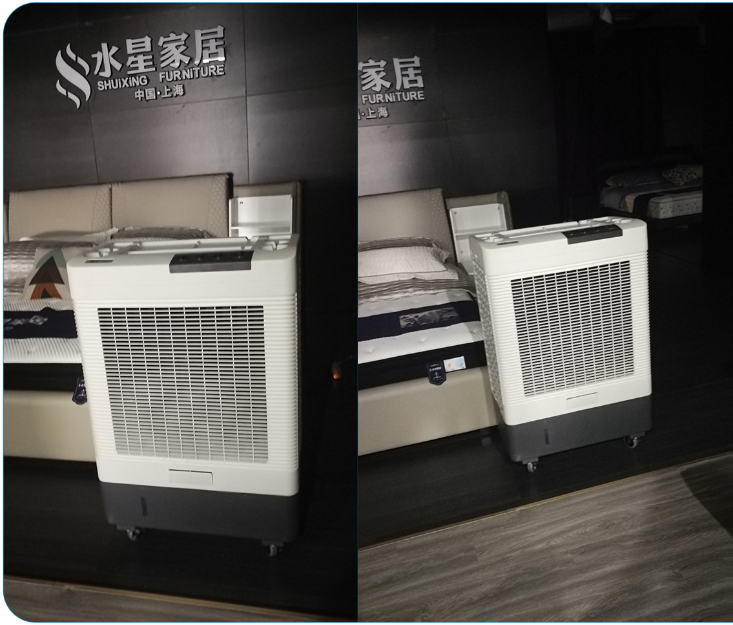 3. 运营压力与传统方案失效:为保障运营,部分家居商场尝试各类降温措施:传统中央空调初始投资高、运行能耗大;吊顶风扇或落地风扇仅能实现空气流动,无法降低温度,还会吹乱布艺窗帘、床品等软装展品;喷;冰块降温覆盖范围小、持续时间短,需频繁更换,运营成本高且破坏展厅整洁形象,实操性极差。